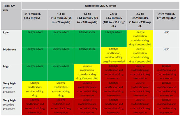 In de “Focused Update” zijn de LDL-C streefwaarden ongewijzigd gebleven ten opzichte van de 2019 richtlijn, maar de drempel om te starten met medicamenteuze LDL-C verlagende therapie is aangescherpt. Bij primaire preventie wordt medicamenteuze therapie aanbevolen bij patiënten met een hoog risico en een LDL-C ≥2.6 mmol/L en bij patiënten met een zeer hoog risico en een LDL-C ≥1.8 mmol/L, ondanks leefstijlinterventie (tabel 2). Daarnaast bestaat er een Klasse IIb-indicatie (IIb = aanbeveling kan worden overwogen) om bij patiënten met een extreem risico (patiënten met herhaaldelijke cardiovasculaire events onder maximaal getolereerde statine therapie en patiënten met multivasculair arterieel vaatlijden) te streven naar een LDL-C <1.0 mmol/L.